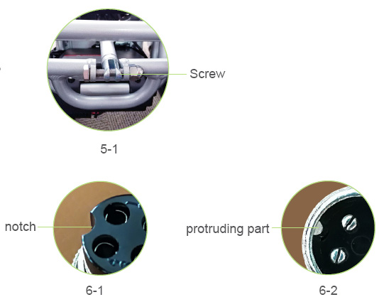 Please connect the charger to the wheelchair before connecting it to the AC power while charging. Please align the notch on the charger (See Picture 6-1) with the protruding part of the charging port (See Picture 6-2), insert and tighten the fixing cap for connection. Please loosen the fixing cap before removing the charger from the wheelchair.